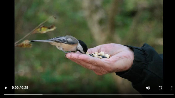 Cheri Hinchman Widzowski took a great photo of a chickadee rejecting a sunflower seed from my hand - and after looking at the other photos she sent to me - I realized that there is a neat sequence she captured! Not only did the chickadee reject that sunflower seed, he then selected a peanut split instead! I put the photos into a very short video format to show the sequence (loops 3 times). I know from previous experience that titmice and nuthatches "always" choose a peanut split over the sunflower seeds available, while for chickadees, it's about half and half. Maybe this individual saw the peanut splits available after initially picking up a sunflower seed. I do see other chickadees rejecting a particular sunflower seed and then selecting a different sunflower seed. I see the birds seeming to feel the seeds in their beaks - by squeezing it - before deciding. Likewise, I see individuals pick up a peanut split, put it back, and then grab a larger one. Of course, the individuals that are more picky are the ones that have already grown confident in being in my hand. New birds, especially, just land, grab, and go in one quick movement.