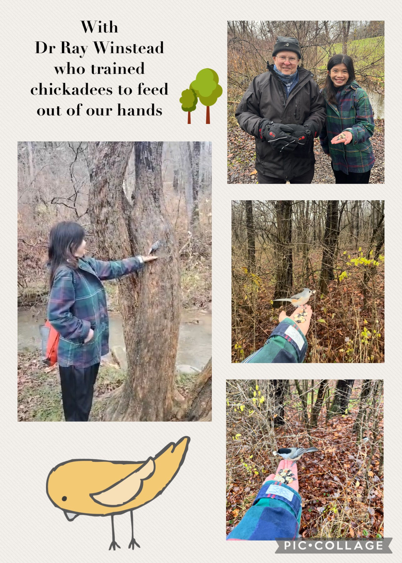 Cecelia Mullen, her mother, and a chickadee.
