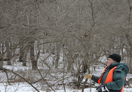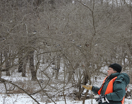 (Birds being fed near the woods were led and enticed farther up into the