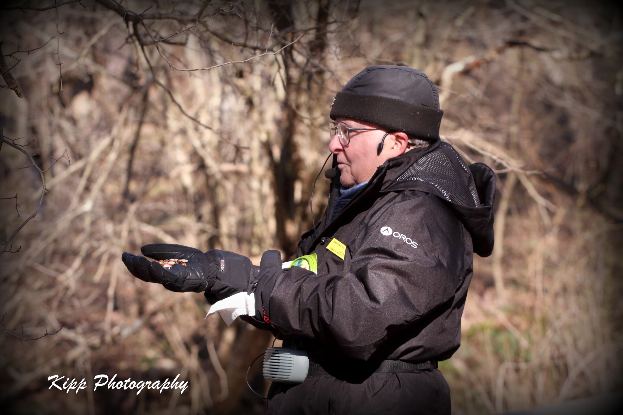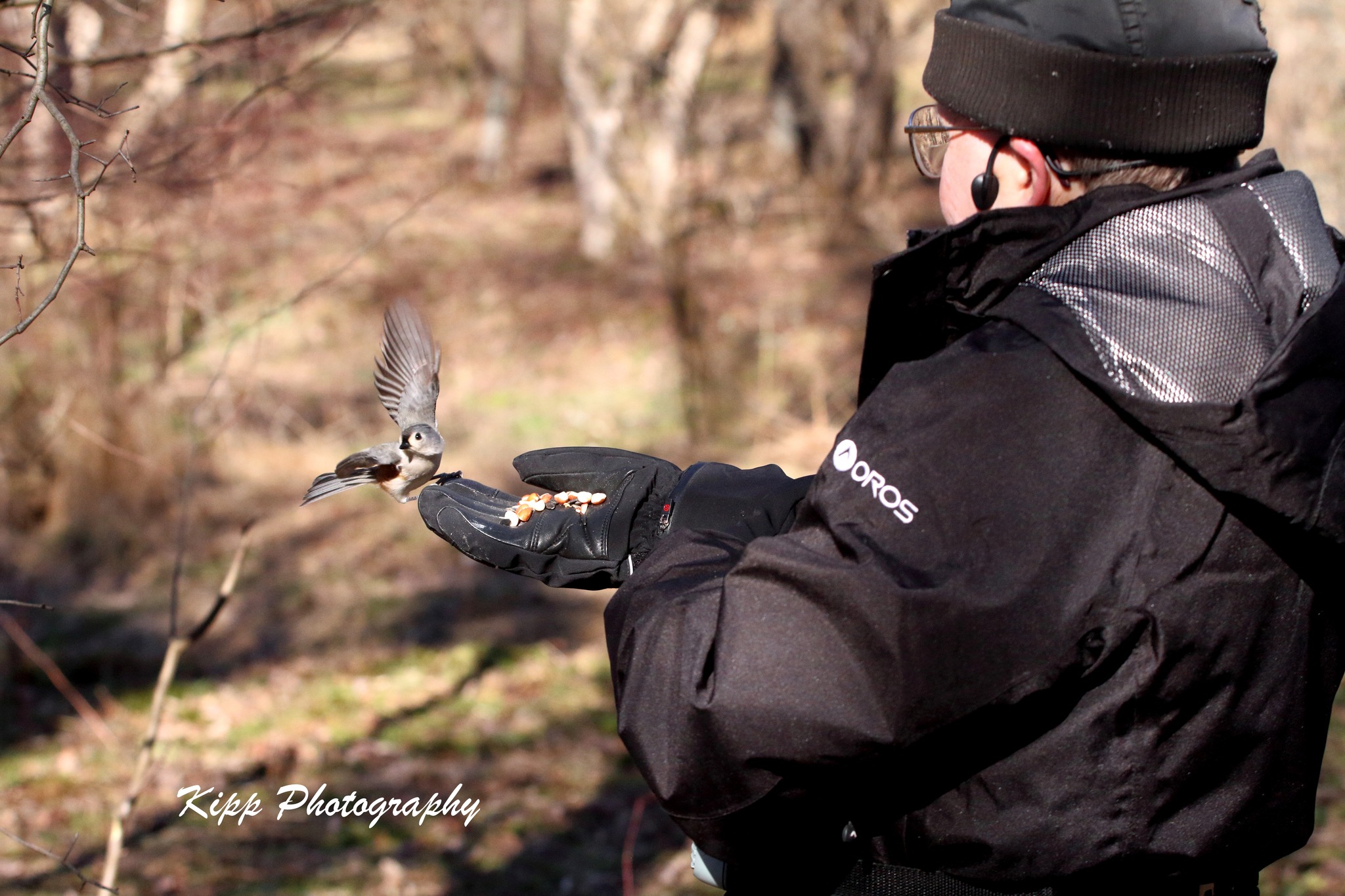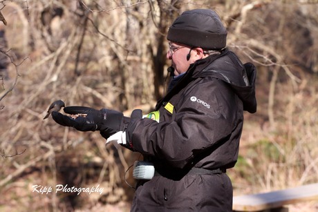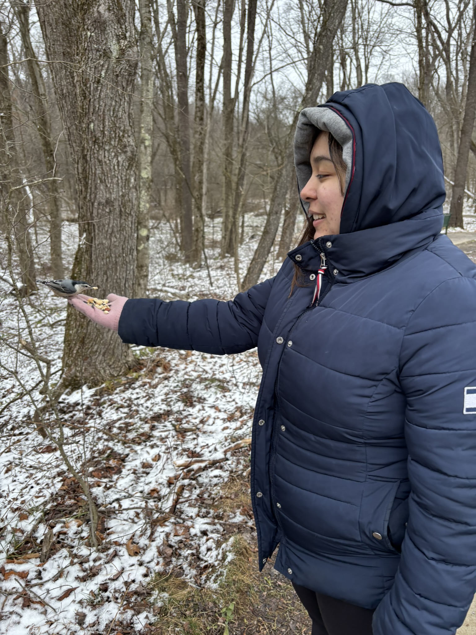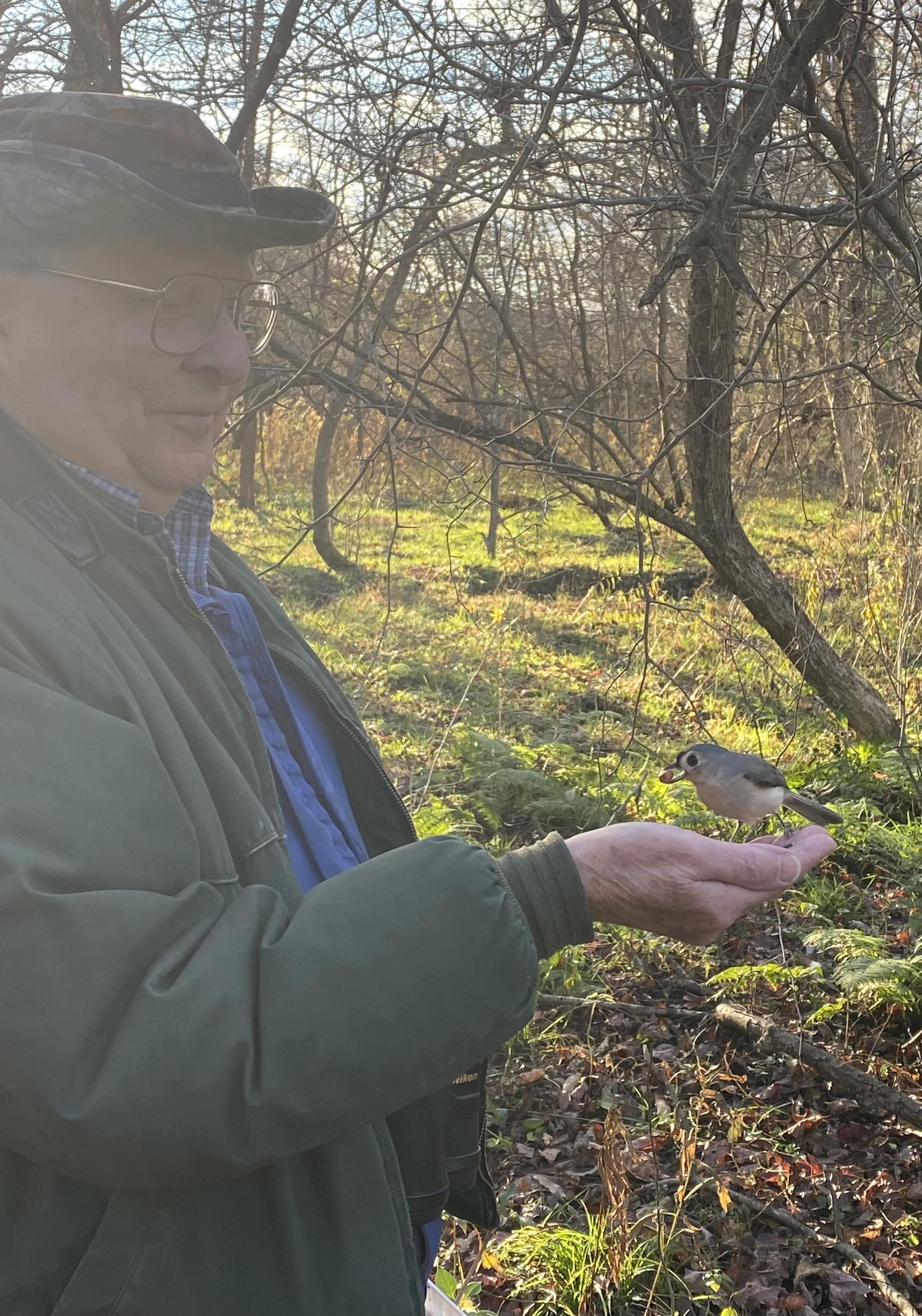 hand. You can see a nuthatch on his hand in this photo. Let's show our