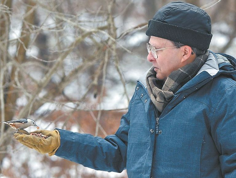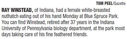 A photo of me feeding a nuthatch was also on the front page of the local newspaper on December 10, 2013. The newspaper photographer Tom Peel was out at the park looking for a shot, so he took photos of me feeding the birds.