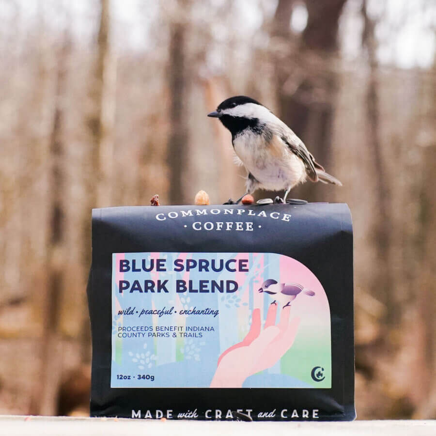 The Blue Spruce Park Blend features an image of a chickadee eating seeds from a