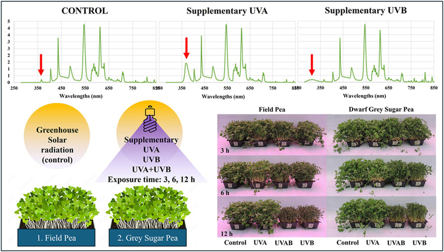 "Exposure time and cultivar modulate supplementary UVA and/or UVB radiation impact on yield components, mineral profile, and phytonutrient content of pea shoots"