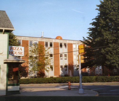 Balloon moored on top of Weyandt Hall as seen from near Pizza House.