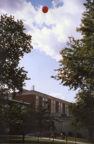 Darlene Richardson walking by Weyandt Hall under the balloon.