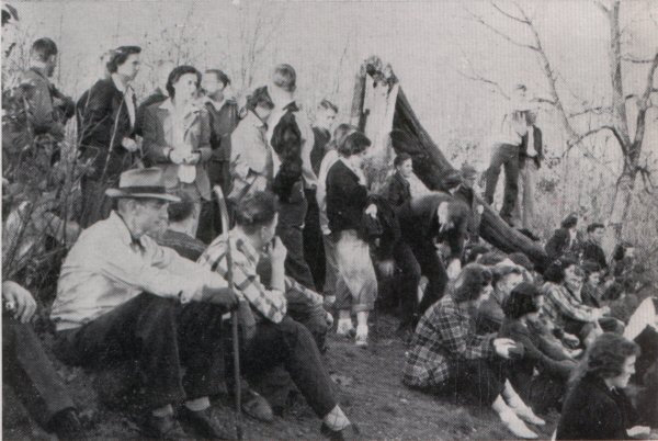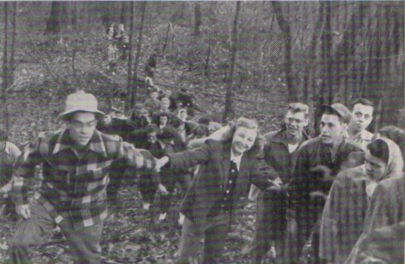 Biologist Merrill Iams is shown here (with hat and walking stick) on a "ten