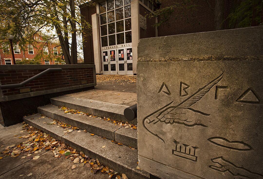 "Leonard Hall is home to several departments in the new College of Arts and Humanities*, developed as part of the IUP NextGen restructuring plan. Those departments are English, History, Philosophy and Religious Studies, and Political Science." Source. (* Note the photos below showing that the building was labeled College of Humanities and Social Sciences. The College is now called the College of Arts, Humanities, Media, and Public Affairs. The Art Department is housed in Sprowls Hall.)