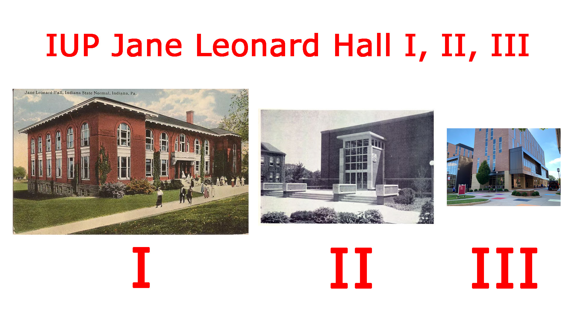 Leonard Hall III was renamed and dedicated November 28, 2022 as Jane E. Leonard Hall, primarily brought about by the encouragement and efforts of retired IUP history professor Dr. Charles Cashdollar and his wife Donna Cashdollar. You can buy Dr. Cashdollar's book The IUP Story: From Normal School to University in the IUP Co-op Store or online.
