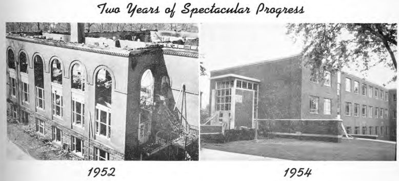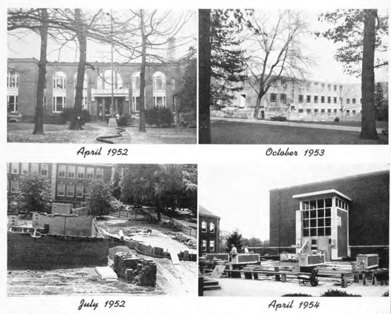Leonard Hall (I), the home of the Department of Science and the Department of English, burned in 1952. The cornerstone of new Leonard Hall (II) was laid in 1953, and Science professors and classes were scattered across campus until the new Leonard Hall (II) was completed. Construction of the new, three-story building is shown below in its early two-story stage. (1954 Yearbook)