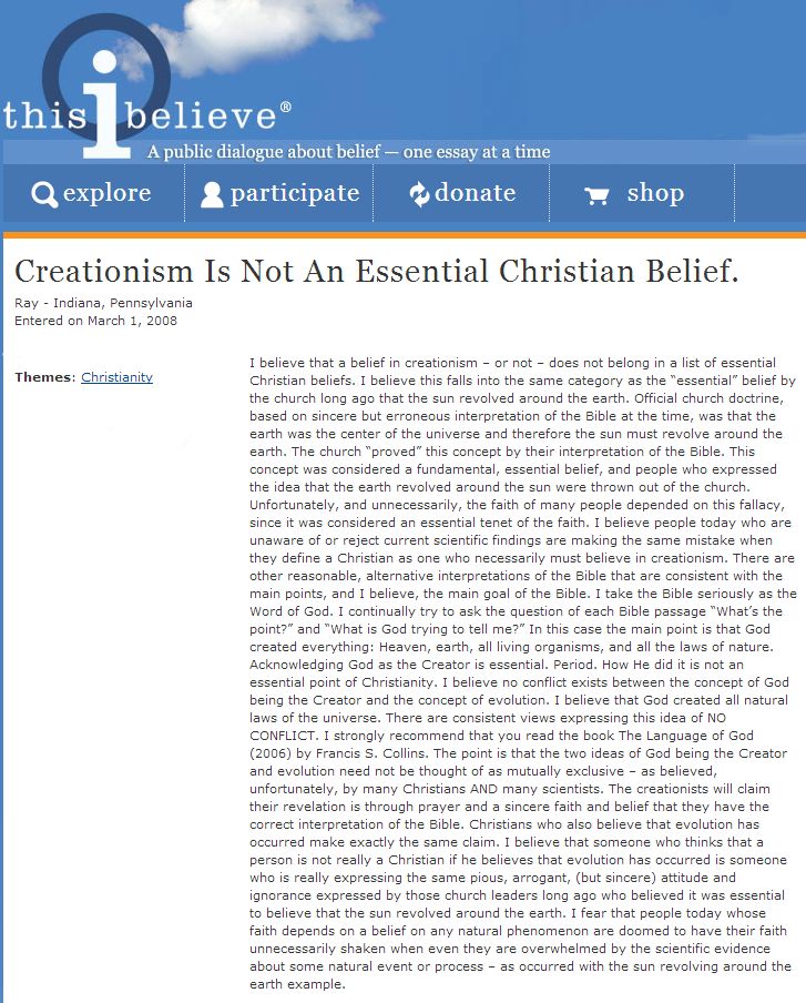 I believe that a belief in creationism – or not – does not belong in a list of essential Christian beliefs. I believe this falls into the same category as the “essential” belief by the church long ago that the sun revolved around the earth. Official church doctrine, based on sincere but erroneous interpretation of the Bible at the time, was that the earth was the center of the universe and therefore the sun must revolve around the earth. The church “proved” this concept by their interpretation of the Bible. This concept was considered a fundamental, essential belief, and people who expressed the idea that the earth revolved around the sun were thrown out of the church. Unfortunately, and unnecessarily, the faith of many people depended on this fallacy, since it was considered an essential tenet of the faith. I believe people today who are unaware of or reject current scientific findings are making the same mistake when they define a Christian as one who necessarily must believe in creationism. There are other reasonable, alternative interpretations of the Bible that are consistent with the main points, and I believe, the main goal of the Bible. I take the Bible seriously as the Word of God. I continually try to ask the question of each Bible passage “What’s the point?” and “What is God trying to tell me?” In this case the main point is that God created everything: Heaven, earth, all living organisms, and all the laws of nature. Acknowledging God as the Creator is essential. Period. How He did it is not an essential point of Christianity. I believe no conflict exists between the concept of God being the Creator and the concept of evolution. I believe that God created all natural laws of the universe. There are consistent views expressing this idea of NO CONFLICT. I strongly recommend that you read the book The Language of God (2006) by Francis S. Collins. The point is that the two ideas of God being the Creator and evolution need not be thought of as mutually exclusive – as believed, unfortunately, by many Christians AND many scientists. The creationists will claim their revelation is through prayer and a sincere faith and belief that they have the correct interpretation of the Bible. Christians who also believe that evolution has occurred make exactly the same claim. I believe that someone who thinks that a person is not really a Christian if he believes that evolution has occurred is someone who is really expressing the same pious, arrogant, (but sincere) attitude and ignorance expressed by those church leaders long ago who believed it was essential to believe that the sun revolved around the earth. I fear that people today whose faith depends on a belief on any natural phenomenon are doomed to have their faith unnecessarily shaken when even they are overwhelmed by the scientific evidence about some natural event or process – as occurred with the sun revolving around the earth example.