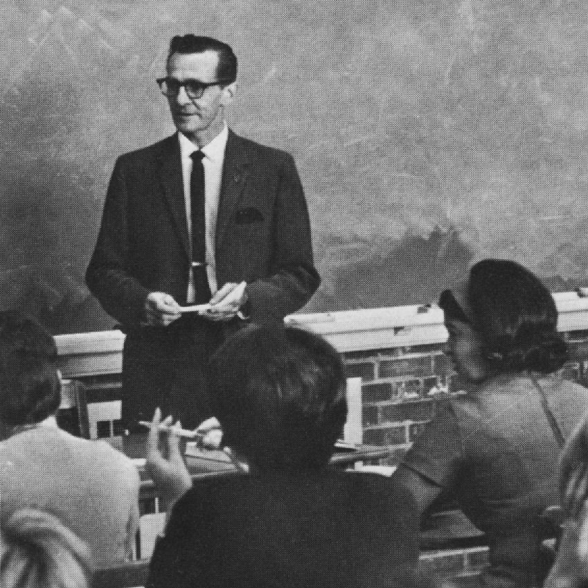 Dr. E. D. Winstead in a classroom as Chairman of the Department of Mathematics at Atlantic Christian College in 1968.