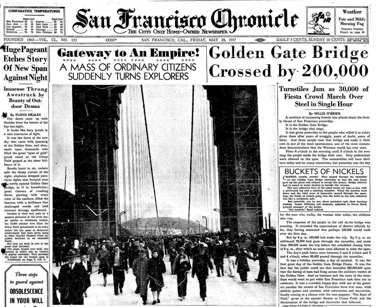 During the time of my assignments to Fort Scott the Golden Gate Bridge was under construction. I watched (from a distance) the construction of the towers and then the weaving of the cables which support the bridge. When it was completed and officially opened for traffic, I joined about two hundred thousand pedestrians who walked across the bridge on May 27, 1937