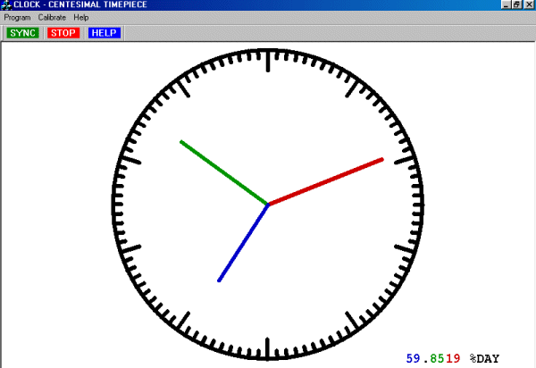 To see what a working analog percentage metric clock would look like, I recommend that you download and try Michael Jenkins' Centesimal Clock.  Note the screen shot below.  Michael Jenkins lives in Brighton in Sussex, England and has consented to my offering it to you here.