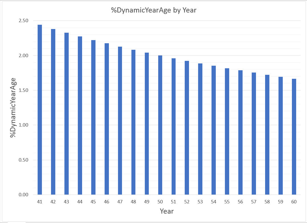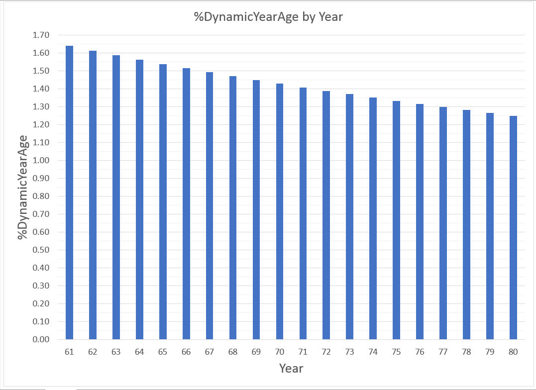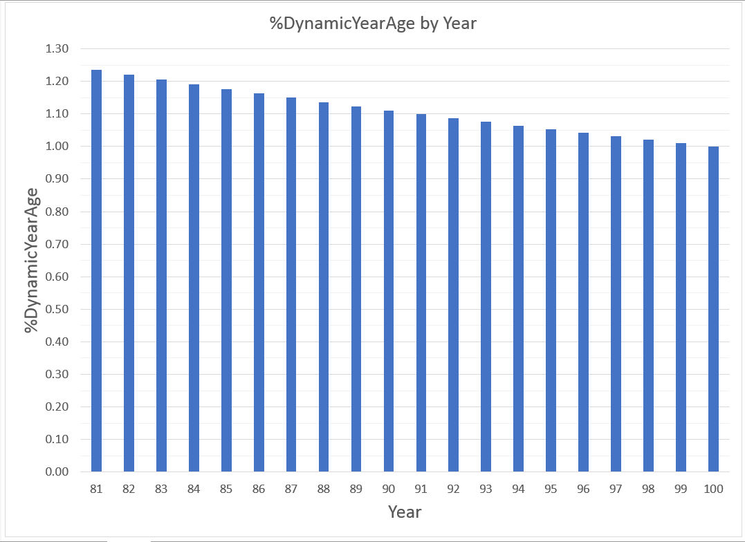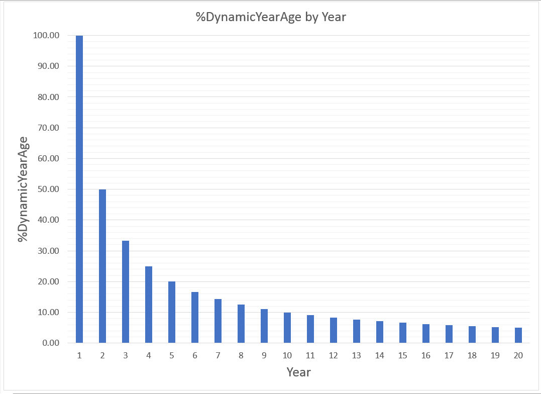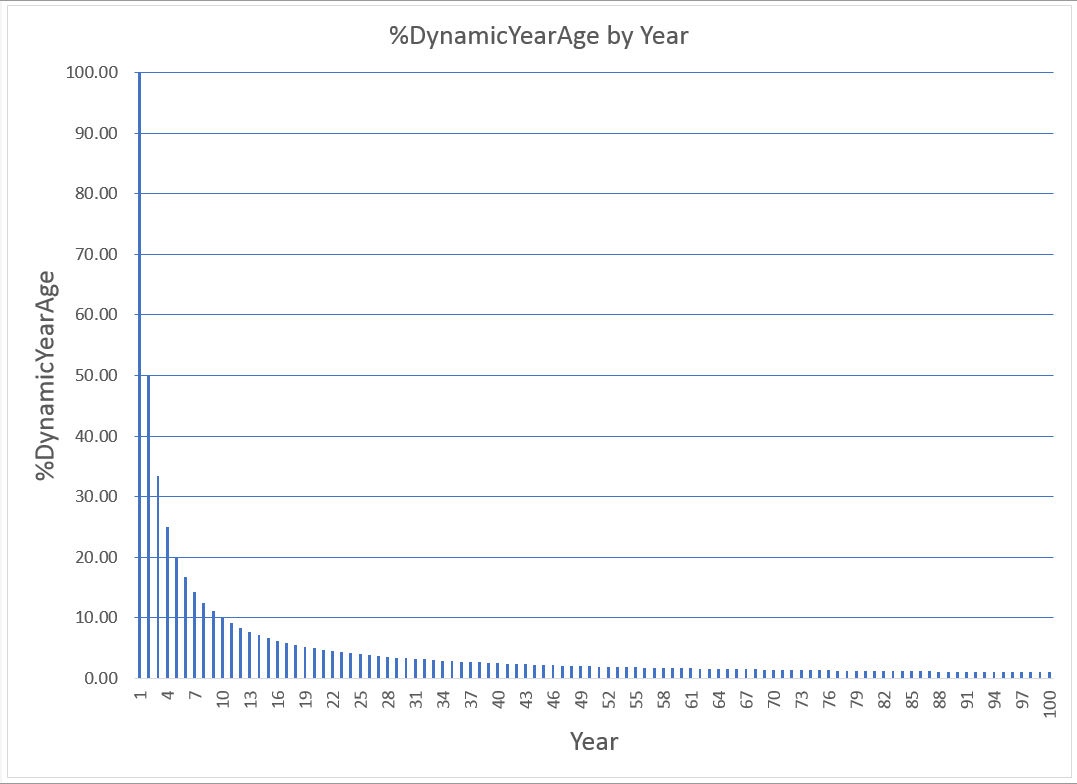 Let %DynamicYearAge = the percentage ONE year is of the number of years already lived = 100%*(1/Age), i.e., = (100/Age)%