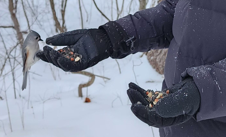 1) Hold your hand still! Especially do not move your hand or body when the birds land! If you move or jerk your hand, then that will scare that bird, and that bird may not come back to you. Be prepared mentally for the possible shock of feeling the feet of a bird landing on your hand. It is a neat experience to have the wild birds land on your bare hand. You can feel the difference in the feet of the different individuals and species when they land. For example, some birds land gently on the palm of your hand, while others will hang on vertically with their claws. The birds will come to your hand whether you have gloves on or not. In the winter, I wear gloves - not because the birds prefer that, but because my hands get cold and I can stay out longer with gloves. On really cold days, I wear heated gloves. The birds come either way.