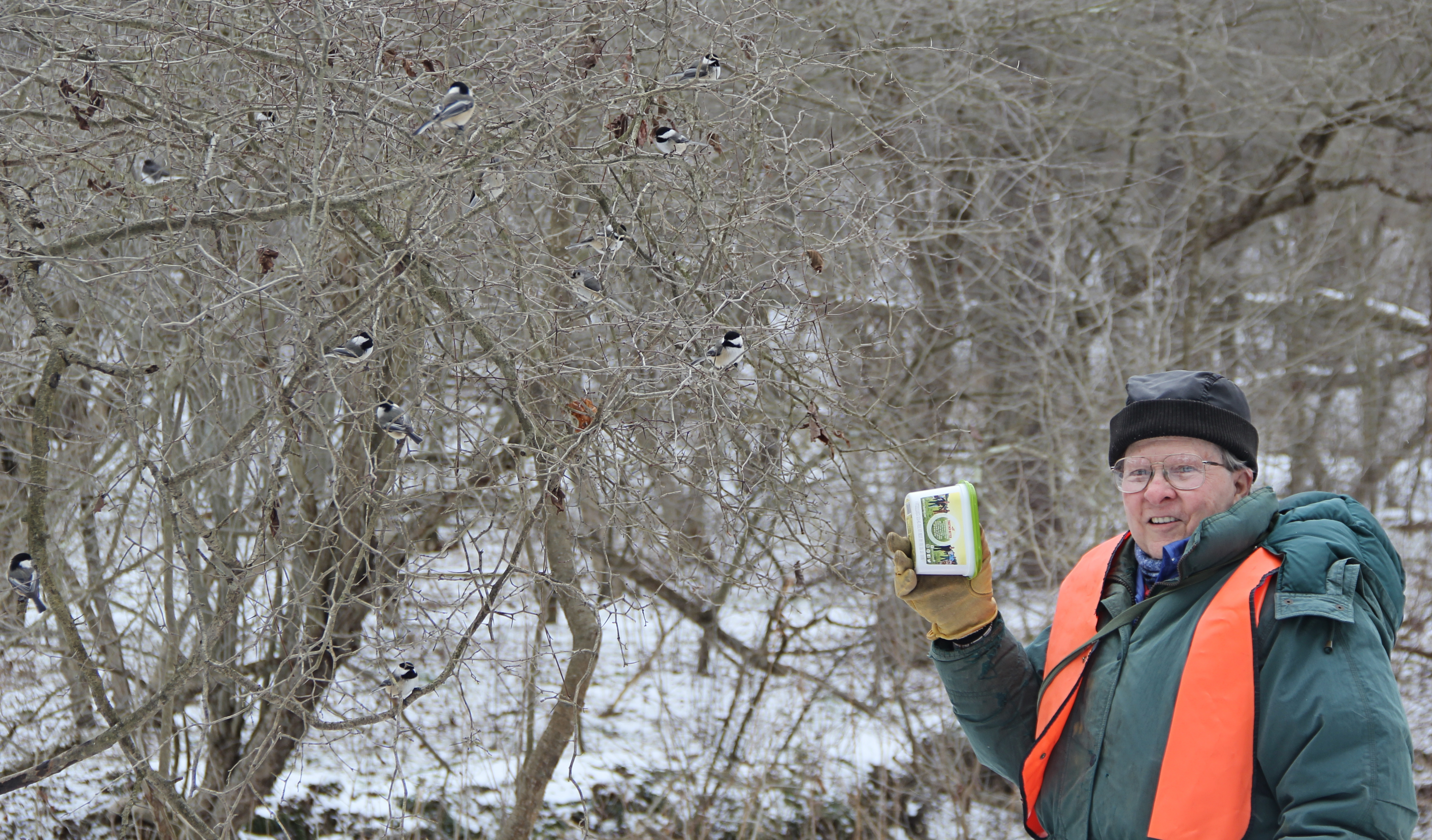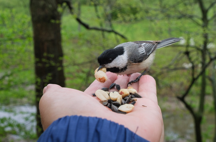 3) Hold out your hand with the seeds very near a branch or twig, rather than standing in the middle of the trail. The birds recognize individual people, and the birds prefer to land on a twig to check out new people more carefully before flying to your hand. (After they know you well, then they will accost you no matter how far away from the trees you are, even if you are moving along the trail or out in the open.) Research studies show that the birds identify individual people by their faces. My wearing different clothes does not seem to matter one way or the other to the birds.
